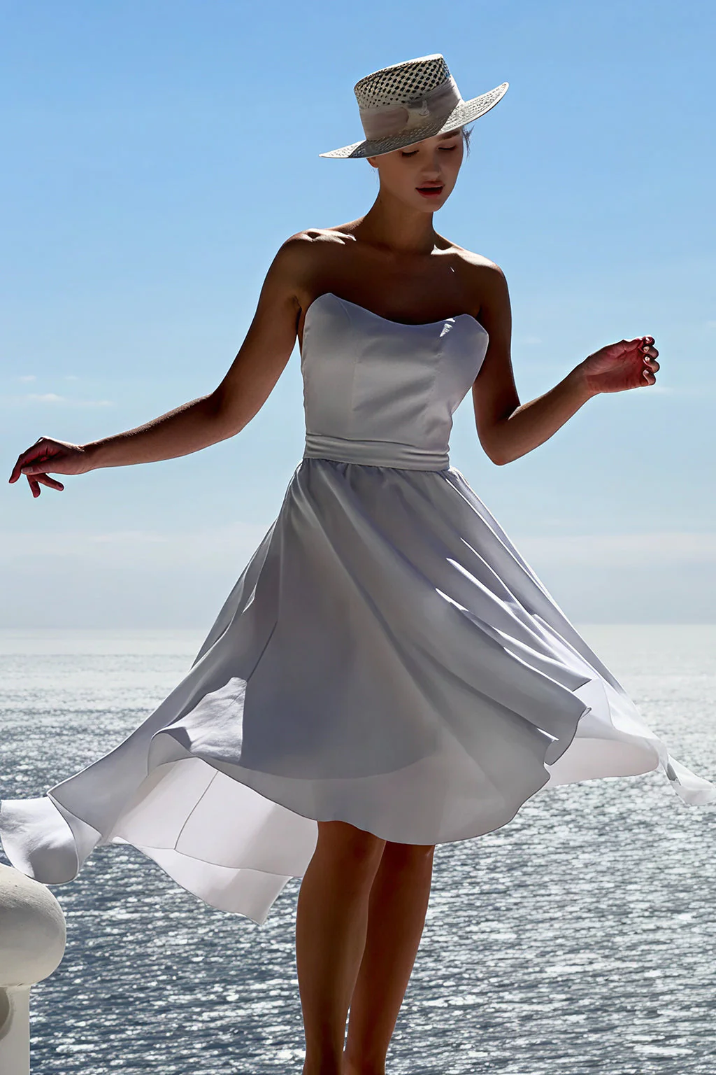 The Marilyn Dress is defined by a clean, strapless bustier that shapes the upper body with precision. Linen piqué gives the bodice a compact hand, balanced by the openness of the full skirt. The structured waistband, knotted at the back, stabilises the construction and organises volume. The hemline develops with an irregular progression, shorter at the front and extended at the back, supporting continuous movement. The overall structure maintains a controlled formal presence suited to structured summer settings.