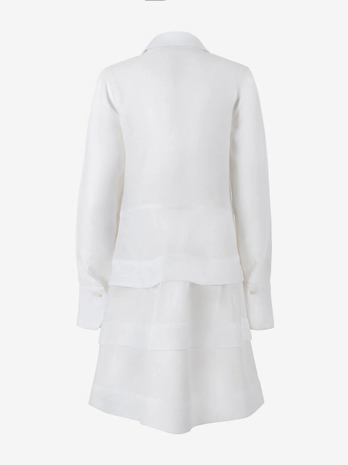 The Athina Dress is built on a clean shirt-style structure, defined by measured volumes and a continuous line. Linen piqué gauze combines lightness with natural structure, allowing the garment to retain shape while remaining fluid. Overlapping horizontal ruffles create a rhythmic progression along the length without disrupting balance. The adjustable waist drawstring offers functional control of the fit. The overall design supports a fluid, orderly reading suited to everyday summer wear.