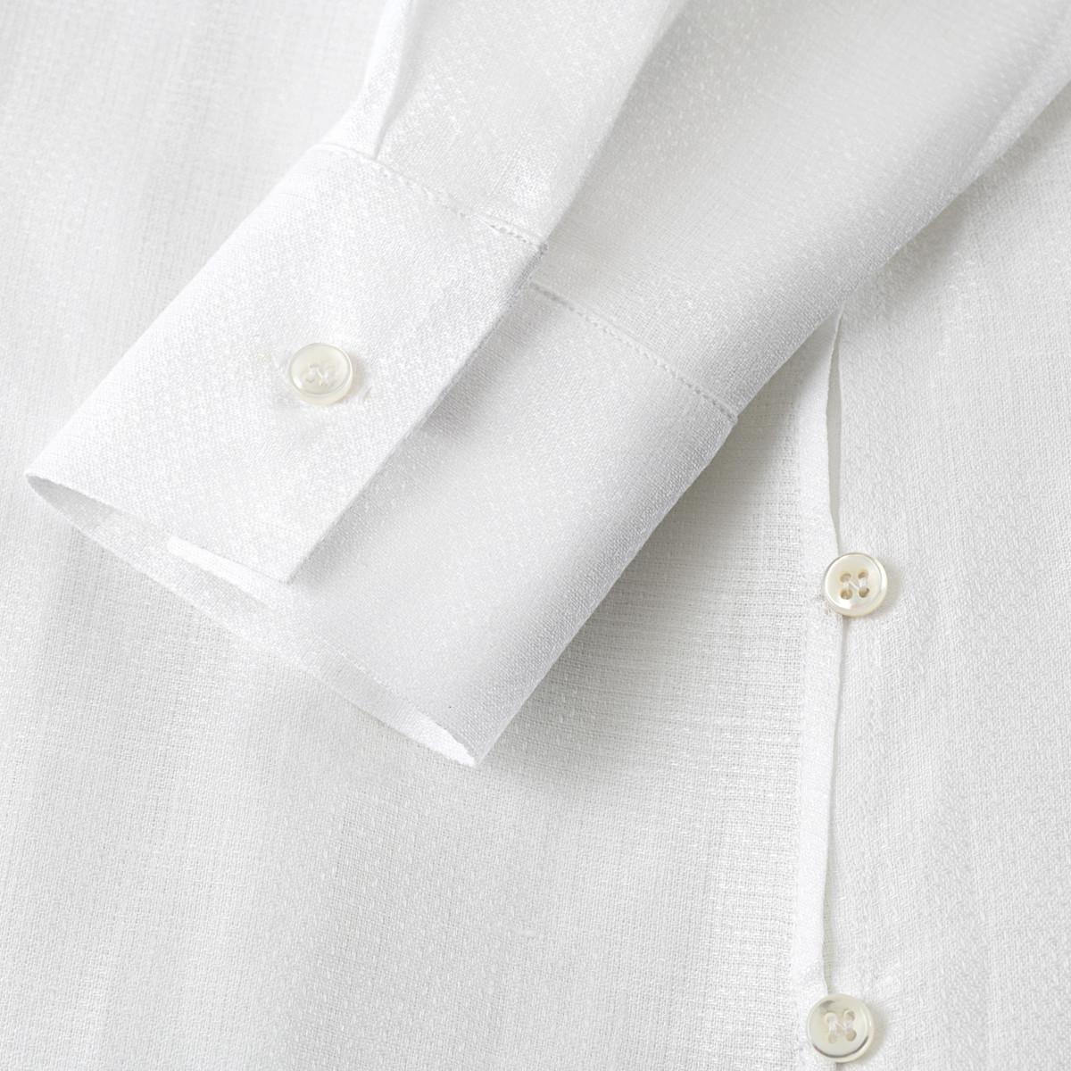 The Victoria Shirt Dress is an elongated chemisier in linen piqué, designed for a continuous vertical line and fluid wear. A classic shirt collar and a front button placket define a clean structure, finished with tone-on-tone mother-of-pearl buttons. At the back, a central pleat regulates volume and supports movement. A side button feature with floating loops allows adjustable openings along the leg line. The length supports a dual use, shifting between a dress and a lightweight overshirt.