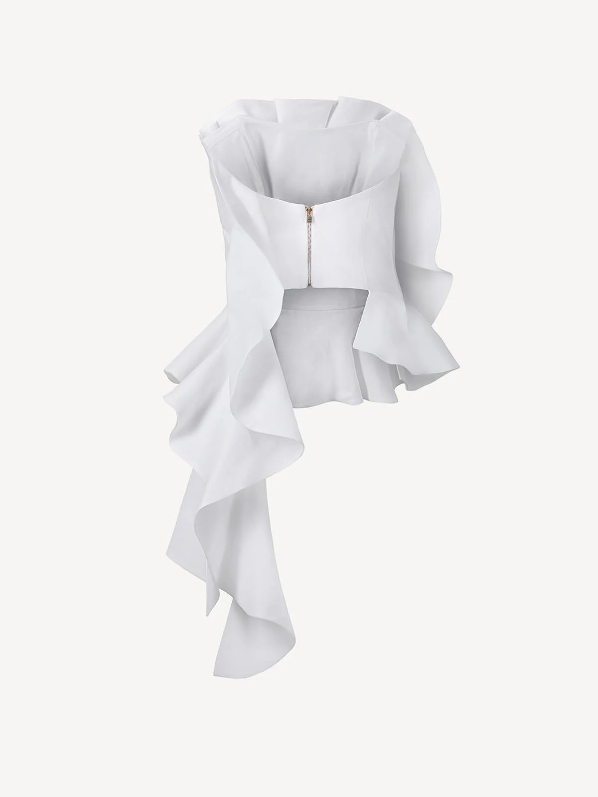 The Fiore Grande Top defines the bust line through a clean, fitted structure. The herringbone linen introduces a compact, textured surface that supports the design of the garment. On the front, a three-dimensional construction stands out, created through folds of fabric shaped into a floral form. From the waist, the volume opens into a flared hem with an asymmetric development that continues into a soft drape.