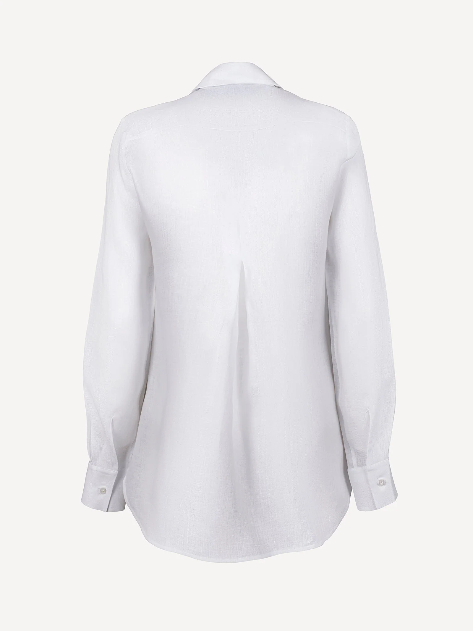 The Nada Shirt develops a classic linen base defined by a light and uniform surface. The front features a panel with three-dimensional geometric embroidery on the chest, integrated into the structure without altering the line. The front closure is concealed, maintaining visual continuity. The fit is regular, with a rounded hem and clean back construction. The Nada Shirt centres its identity on the balance between essential structure and geometric front intervention.