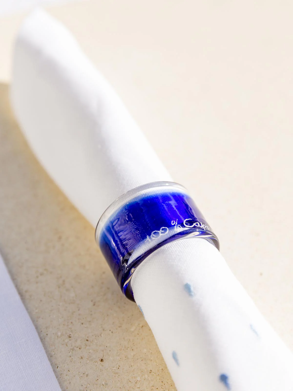 Napkin ring with 100% Capri logo. Made of high quality blown glass, it plays with shades of color that creep into the glassy transparency.