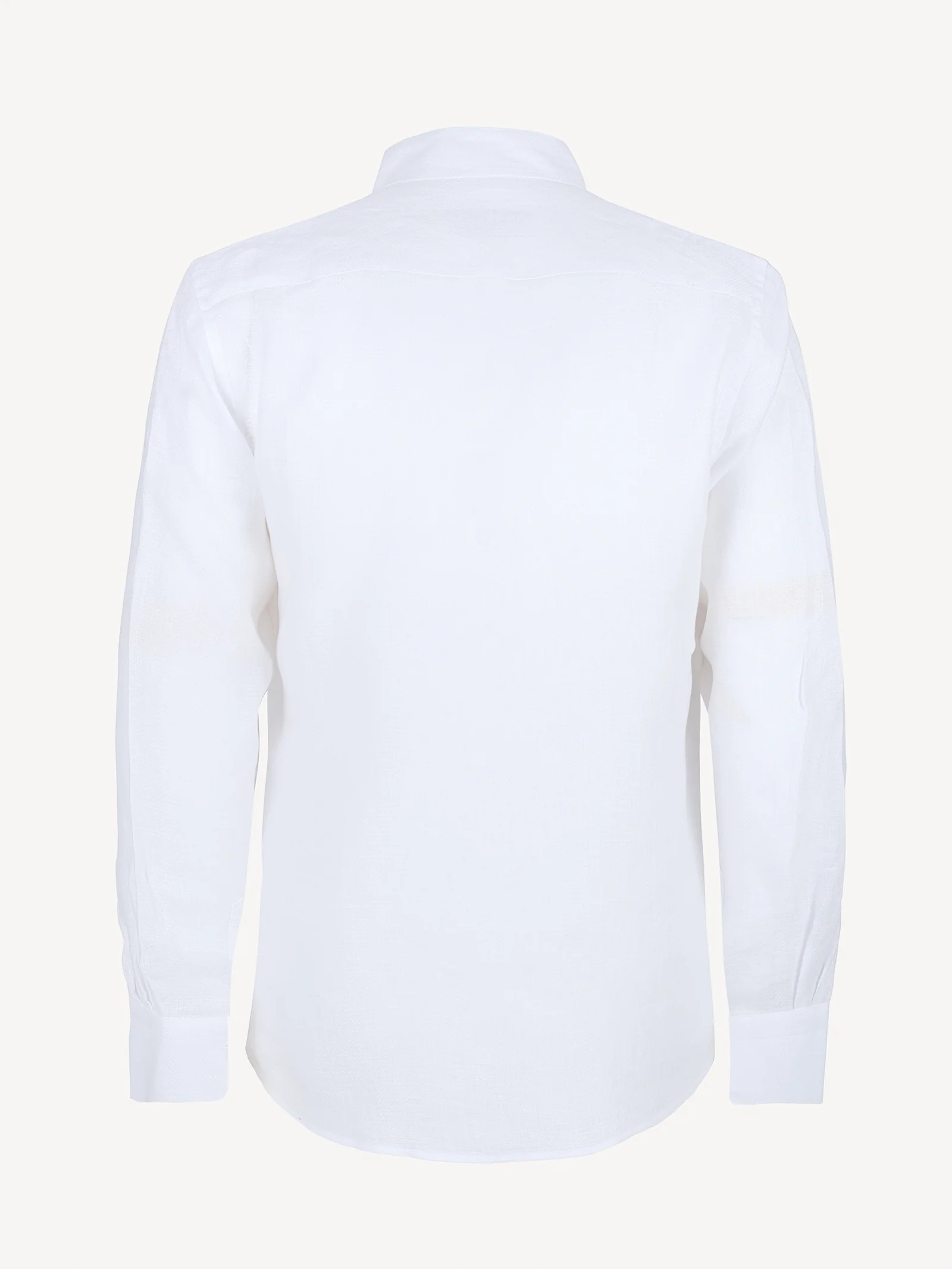 The Tiberio Shirt is crafted from linen piqué, defined by a breathable and structured surface. The diplomatic collar creates a clean and controlled neckline, while the hidden front button closure preserves a minimal appearance. A visible mother-of-pearl button at the base of the collar and on the cuffs adds a discreet sartorial detail. The rear yoke supports structural balance. Designed for versatile use across refined casual and formal settings.